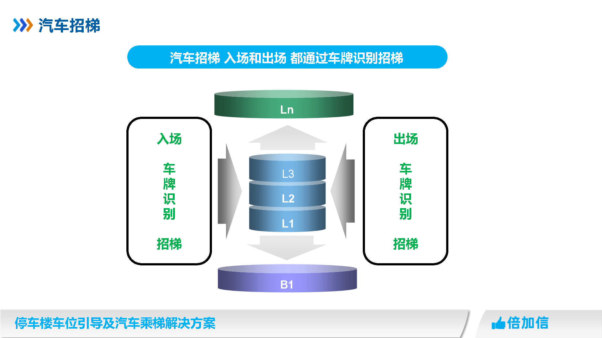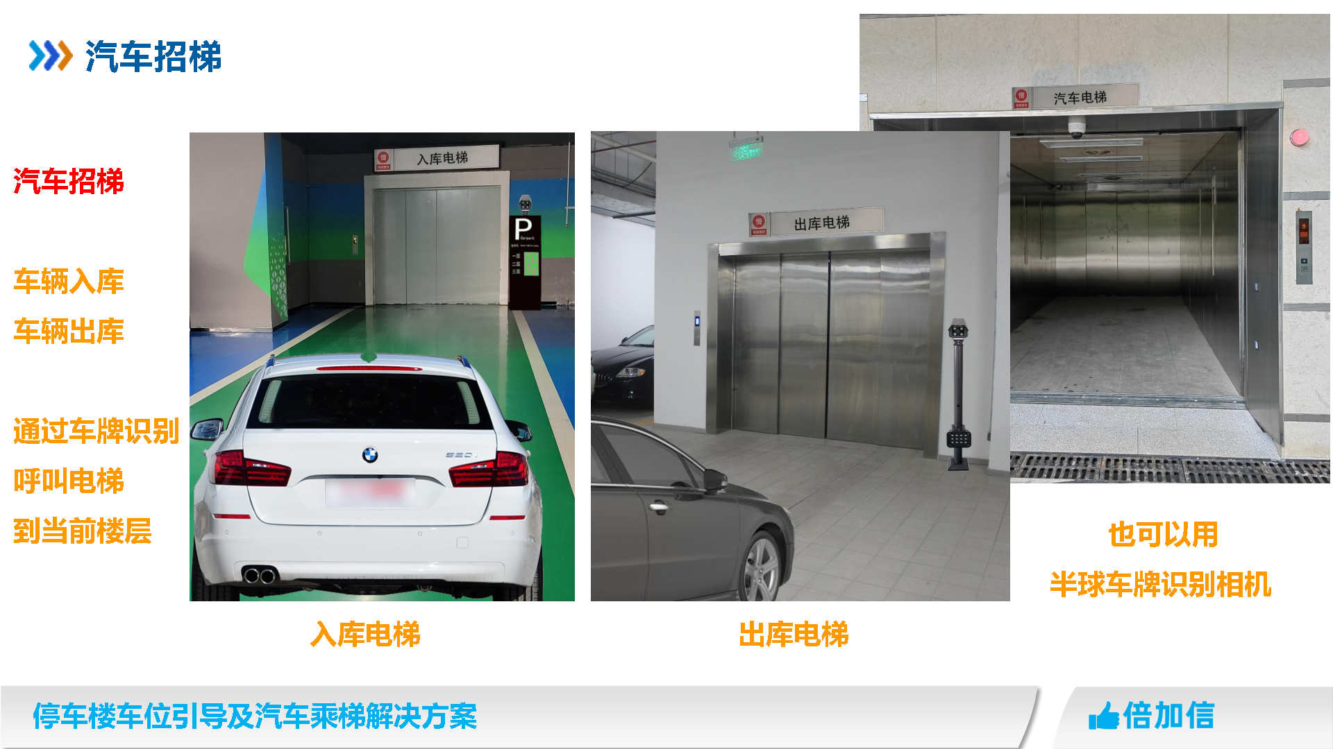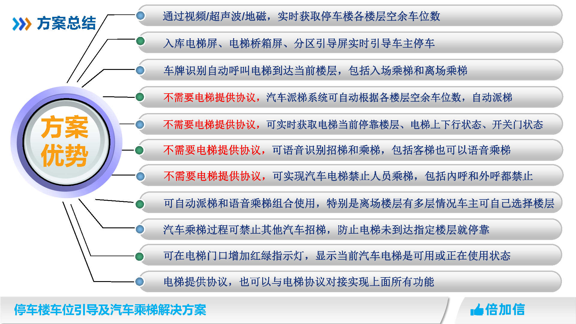 倍加信汽車乘梯系統(tǒng)方案優(yōu)勢 1、通過視頻/超聲波/地磁,實(shí)時獲取停車樓各樓層空余車位數(shù)/ 2、入庫電梯屏、電梯橋箱屏、分區(qū)引導(dǎo)屏實(shí)時引導(dǎo)車主停車 3、車牌識別自動呼叫電梯到達(dá)當(dāng)前樓層,包括入場乘梯和離場乘梯 4、不需要電梯提供協(xié)議,汽車派梯系統(tǒng)可自動根據(jù)各樓層空余車位數(shù),自動派梯 5、不需要電梯提供協(xié)議,可實(shí)時獲取電梯當(dāng)前?繕菍印㈦娞萆舷滦袪顟B(tài)、開關(guān)門狀態(tài) 6、不需要電梯提供協(xié)議,可語音識別招梯和乘梯,包括客梯也可以語音乘梯 7、不需要電梯提供協(xié)議,可實(shí)現(xiàn)汽車電梯禁止人員乘梯,包括內(nèi)呼和外呼都禁止 8、可自動派梯和語音乘梯組合使用,特別是離場樓層有多層情況車主可自己選擇樓層 9、汽車乘梯過程可禁止其他汽車招梯,防止電梯未到達(dá)指定樓層就停靠 10、可在電梯門口增加紅綠指示燈,顯示當(dāng)前汽車電梯是可用或正在使用狀態(tài) 11、電梯提供協(xié)議,也可以與電梯協(xié)議對接實(shí)現(xiàn)上面所有功能
