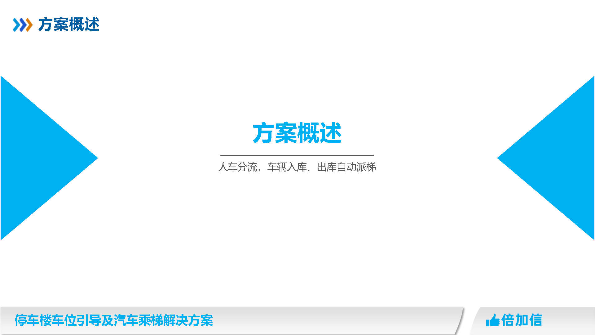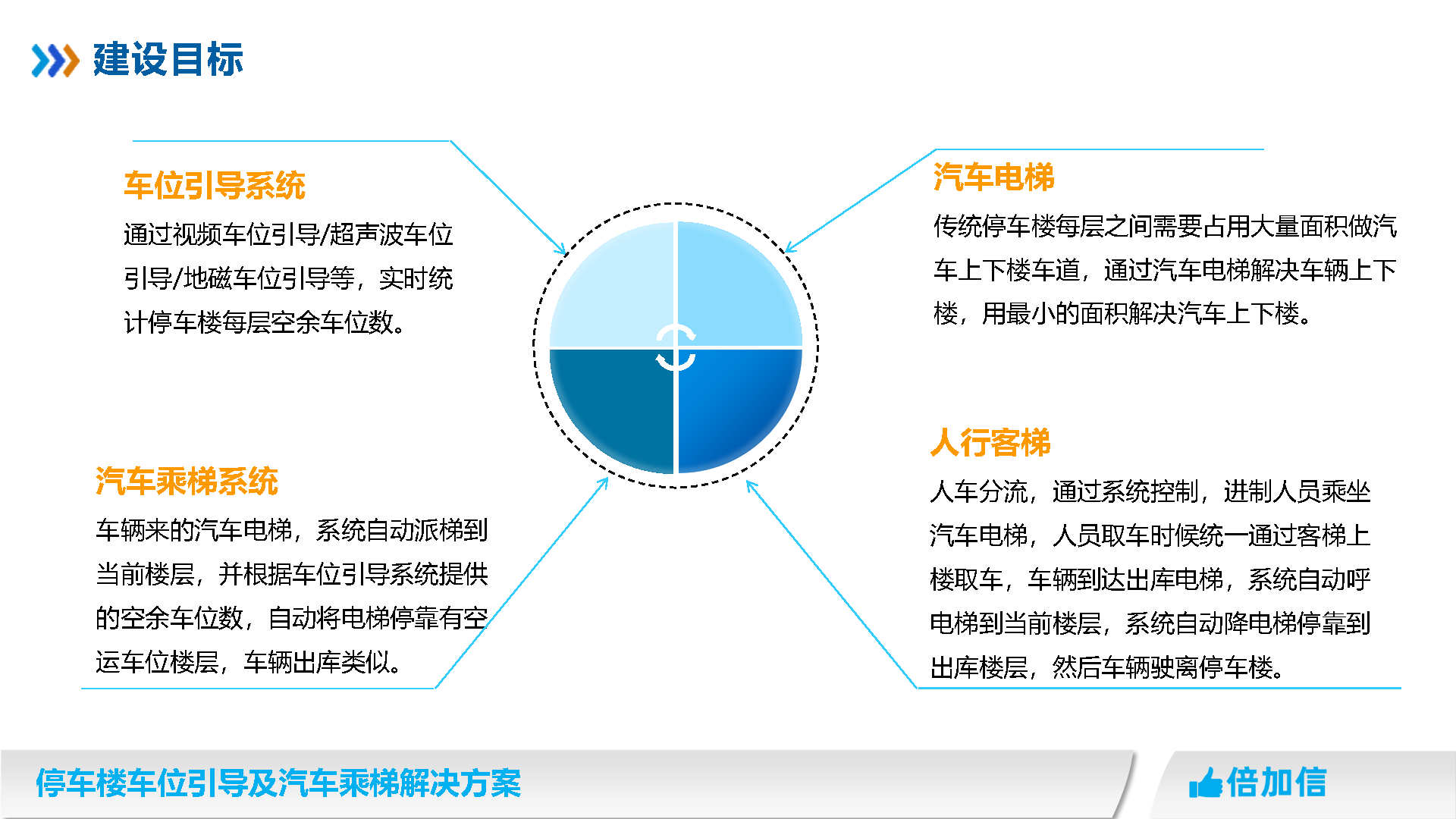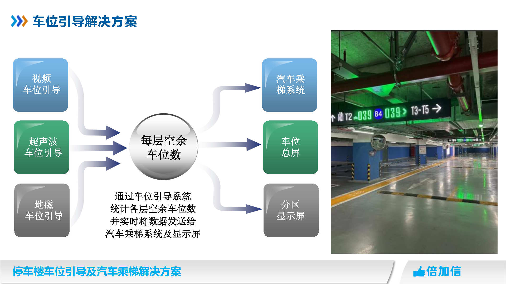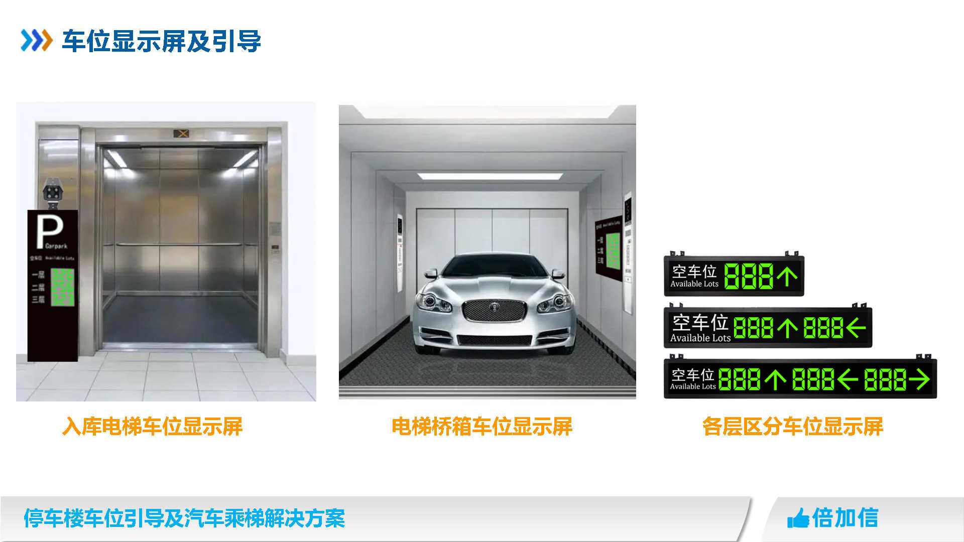 倍加信汽車乘梯系統(tǒng)方案優(yōu)勢 1、通過視頻/超聲波/地磁,實(shí)時獲取停車樓各樓層空余車位數(shù)/ 2、入庫電梯屏、電梯橋箱屏、分區(qū)引導(dǎo)屏實(shí)時引導(dǎo)車主停車 3、車牌識別自動呼叫電梯到達(dá)當(dāng)前樓層,包括入場乘梯和離場乘梯 4、不需要電梯提供協(xié)議,汽車派梯系統(tǒng)可自動根據(jù)各樓層空余車位數(shù),自動派梯 5、不需要電梯提供協(xié)議,可實(shí)時獲取電梯當(dāng)前?繕菍印㈦娞萆舷滦袪顟B(tài)、開關(guān)門狀態(tài) 6、不需要電梯提供協(xié)議,可語音識別招梯和乘梯,包括客梯也可以語音乘梯 7、不需要電梯提供協(xié)議,可實(shí)現(xiàn)汽車電梯禁止人員乘梯,包括內(nèi)呼和外呼都禁止 8、可自動派梯和語音乘梯組合使用,特別是離場樓層有多層情況車主可自己選擇樓層 9、汽車乘梯過程可禁止其他汽車招梯,防止電梯未到達(dá)指定樓層就停靠 10、可在電梯門口增加紅綠指示燈,顯示當(dāng)前汽車電梯是可用或正在使用狀態(tài) 11、電梯提供協(xié)議,也可以與電梯協(xié)議對接實(shí)現(xiàn)上面所有功能