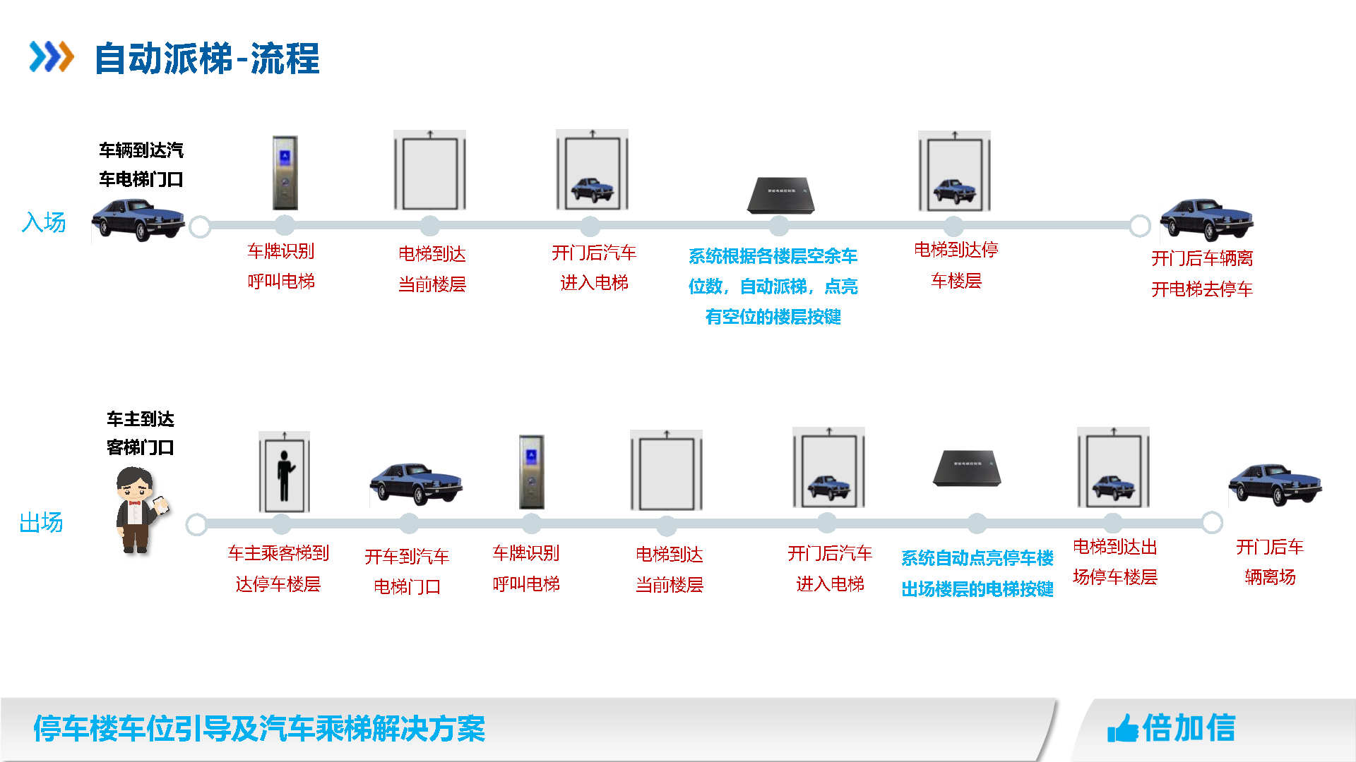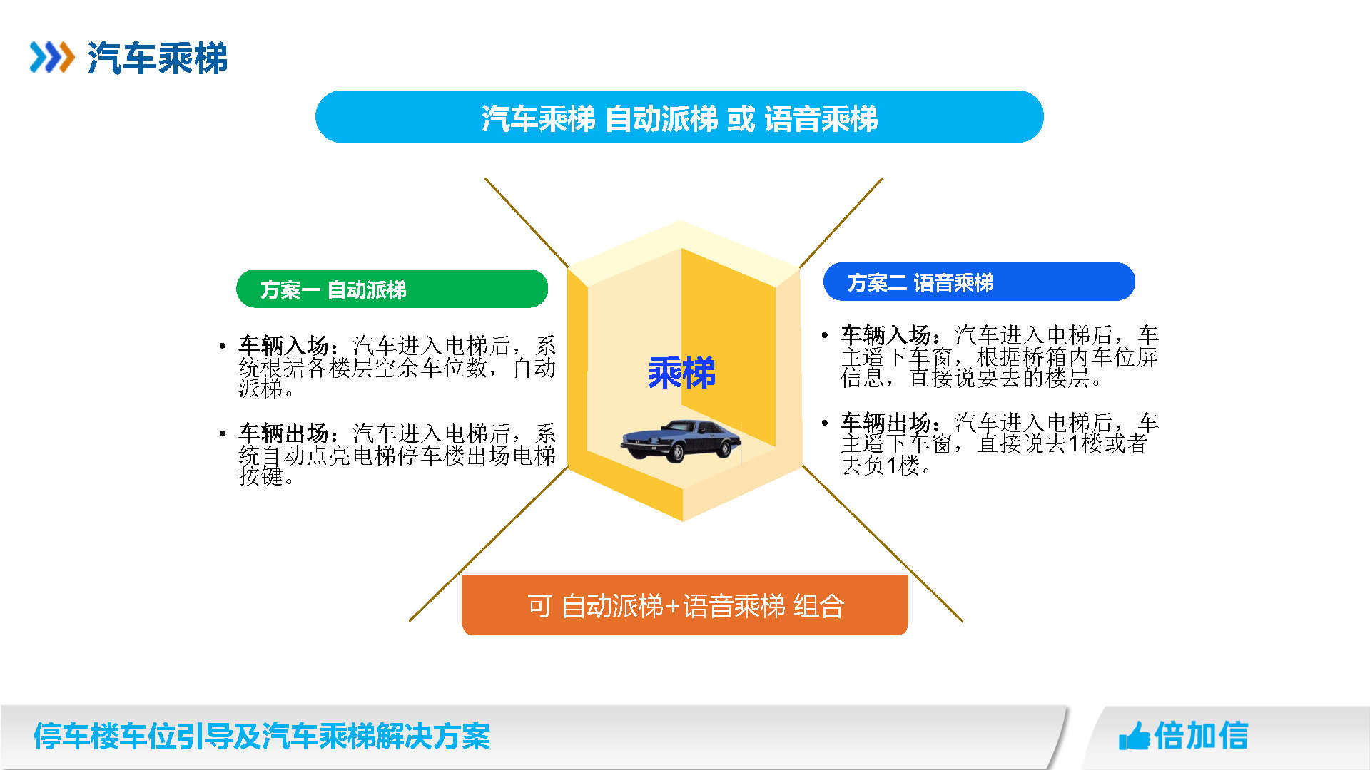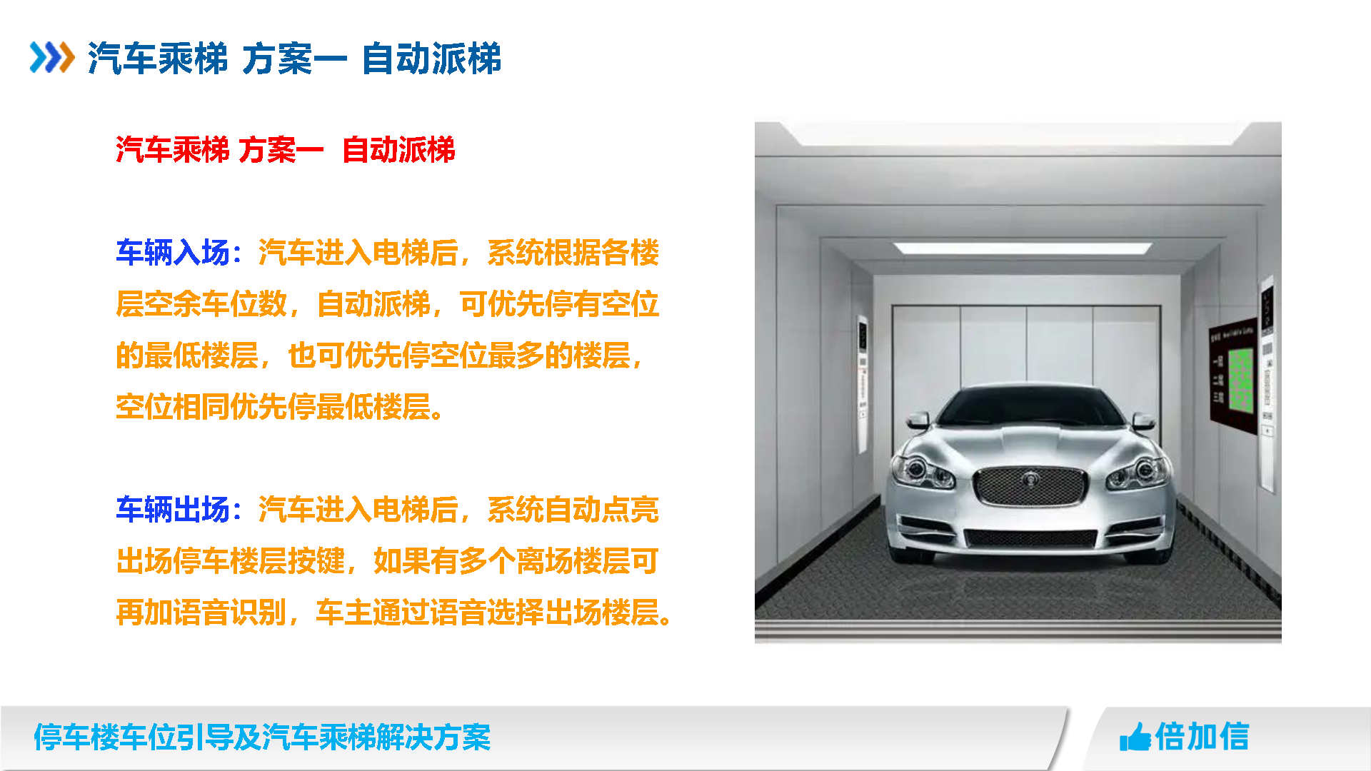 汽車乘梯 方案一 自動派梯 車輛入場:汽車進(jìn)入電梯后,系統(tǒng)根據(jù)各樓層空余車位數(shù),自動派梯,可優(yōu)先停有空位的最低樓層,也可優(yōu)先?瘴蛔疃嗟臉菍,空位相同優(yōu)先停最低樓層。 車輛出場:汽車進(jìn)入電梯后,系統(tǒng)自動點(diǎn)亮出場停車樓層按鍵,如果有多個離場樓層可再加語音識別,車主通過語音選擇出場樓層