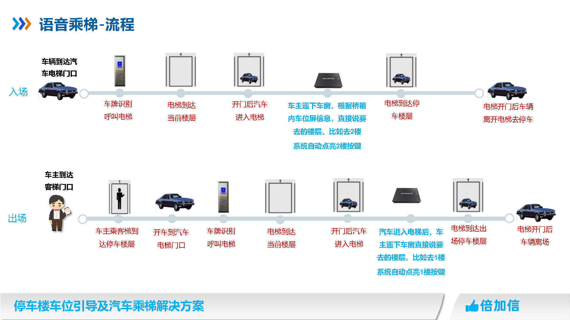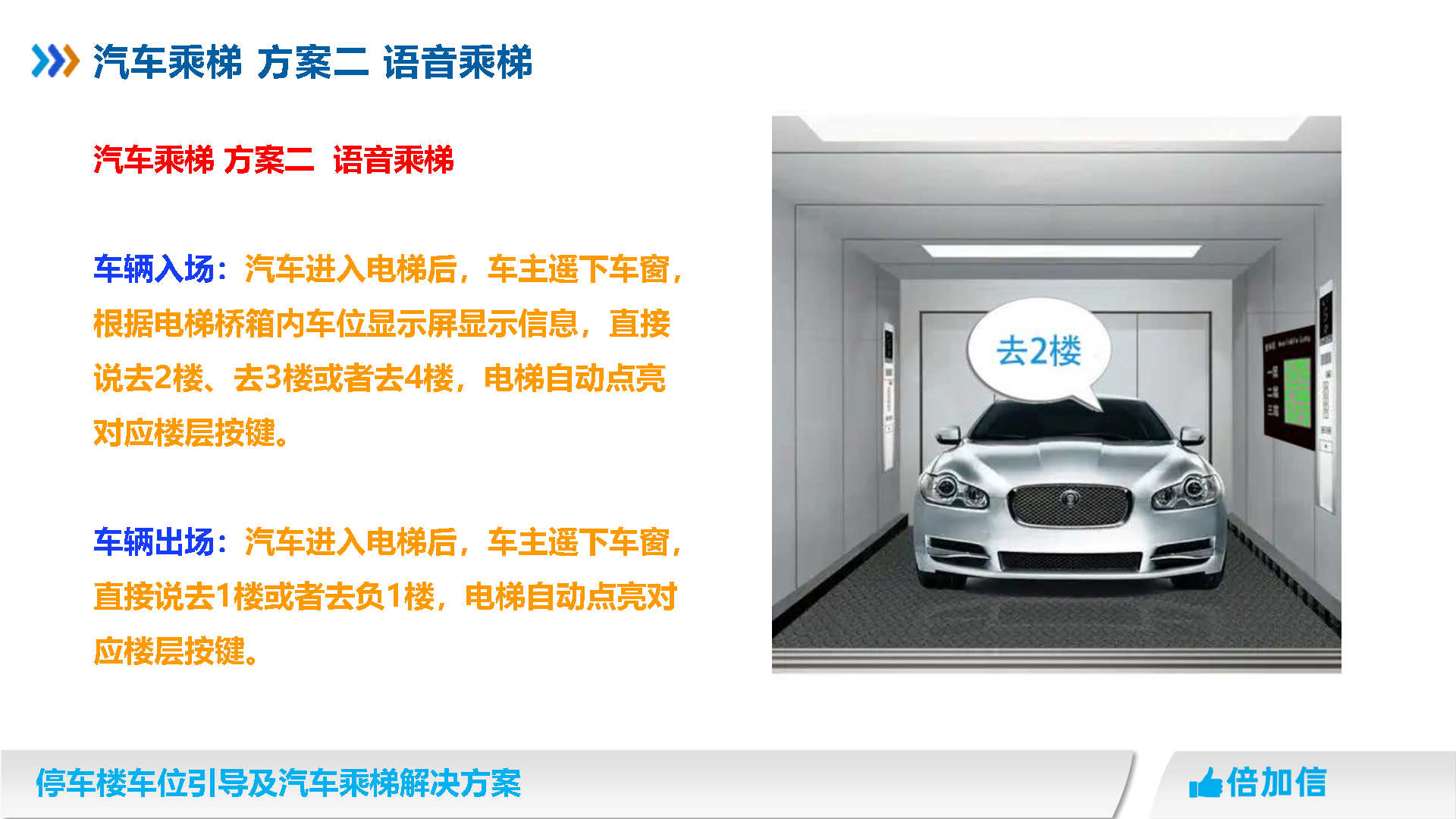 汽車乘梯 方案二 語音乘梯 車輛入場:汽車進(jìn)入電梯后,車主遙下車窗,根據(jù)電梯橋箱內(nèi)車位顯示屏顯示信息,直接說去2樓、去3樓或者去4樓,電梯自動點(diǎn)亮對應(yīng)樓層按鍵。 車輛出場:汽車進(jìn)入電梯后,車主遙下車窗,直接說去1樓或者去負(fù)1樓,電梯自動點(diǎn)亮對應(yīng)樓層按鍵。